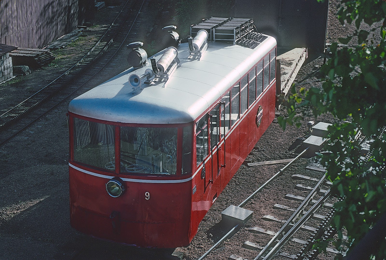 Pikes Peak Railway Car 9 back at the Base Station. It was a work car. Looks like a flat car behind it.